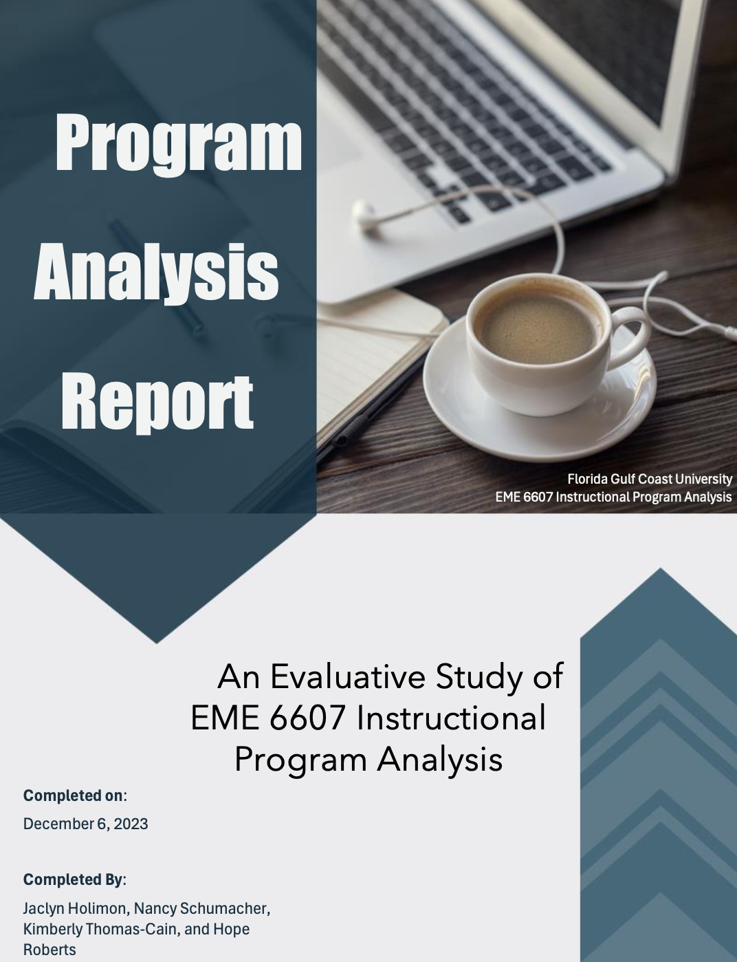 This program analysis focused on the value of EME 6607 Instructional Program Analysis, existing as a core course for the fully-online IDET Program. We used a mixed methods design to collect both quantitative and qualitative data. A semi-structured interview was performed with the course instructor; perceptions of stakeholders were collected through a survey of students, faculty, and professionals working in the instructional design field. Finally, a quality matters review was conducted. This final report represents an evaluative study exploring the perceptions of students, faculty, and professionals in the field of instructional program analysis and the value of EME 6607 Instructional Program Analysis in its context.
